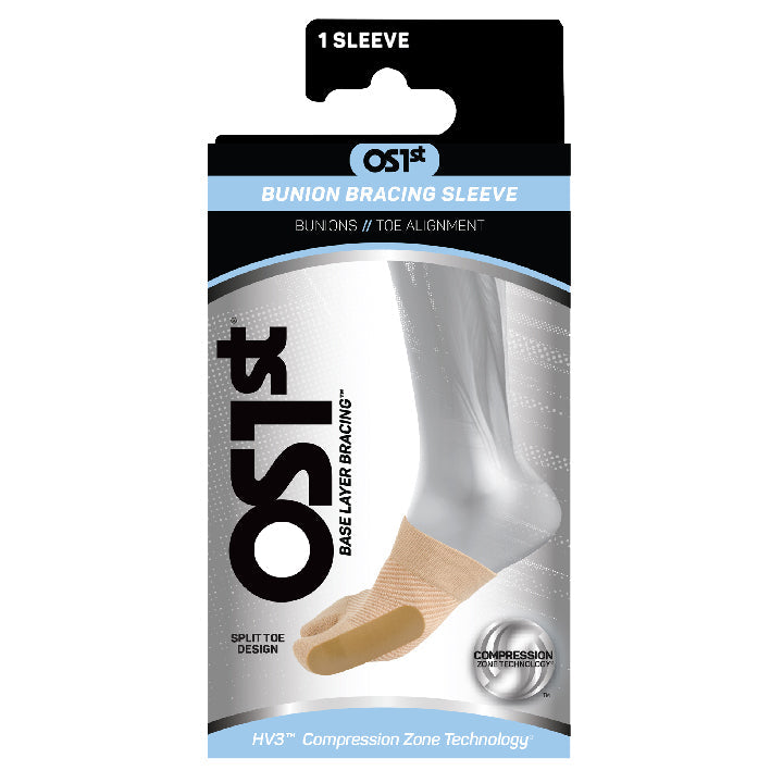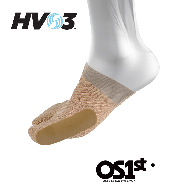 OS1st® HV3™ Bunion Bracing Sleeve 姆趾外翻矯正套。適用於姆趾關節突出及分趾的功能,使用柔軟的腳趾支撐板,調整姆趾突出處角度,並幫助分離腳趾,以進行逐步矯正,減少因姆趾突出而造成的不適感。適合於居家休息時或穿著拖涼鞋時穿著使用;穿著運動鞋或包覆範圍較大鞋款時,建議選購BR4姆趾突出舒緩襪。