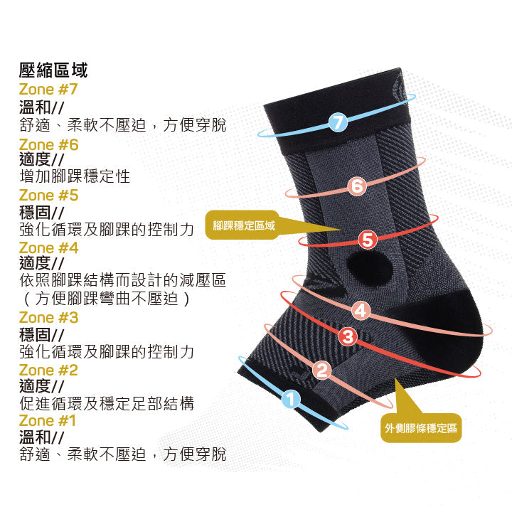 OS1st® AF7® Ankle Bracing Sleeve 高性能腳踝穩定護套,是一款舒適又輕巧的產品,可代替笨重、繁雜的魔鬼氈或限制活動的腳踝固定套,只需將柔軟的尼龍超細纖維穿戴於腳踝上,並在特定區域運用專業KZT技術加壓固定,即可立即感受到完整包覆及支撐。AF7® 高性能腳踝穩定護套能夠提供腳踝內外側的穩定,幫助腳踝平衡以及避免跌倒或扭傷,並減少腳踝腫脹。