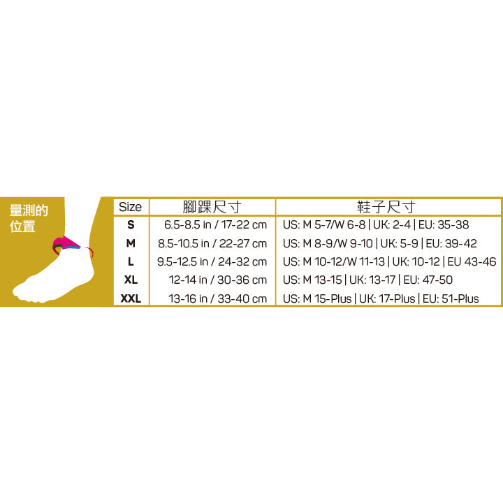 環繞腳踝處之周長,並參考尺寸表選購(測量位置圖示於商品介紹圖中)