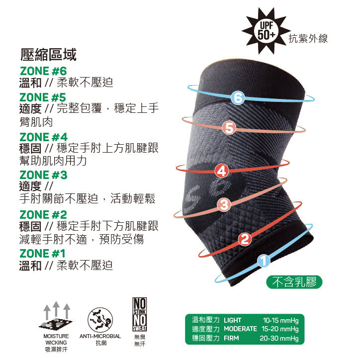 OS1st®ES6™ Elbow Bracing Sleeve 專利設計加壓手肘護套(六段式)使用專利分區壓縮技術®,採用了頂級的精密針織機精準地將產品劃分多個壓力區域,針對肢體關節各部位提供不同壓力值的加壓和穩定,並舒緩因日常生活過度使用而產生的不適。