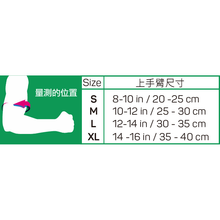環繞上手臂之周長,並參考尺寸表選購 (測量位置圖示於商品介紹圖中)