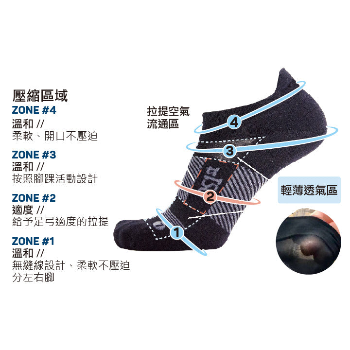 OS1st®TA4™ Thin Air Performance Socks輕薄透氣加壓襪使用專利分區壓縮技術®,採用了頂級的精密針織機精準地將產品劃分多個壓力區域,針對肢體關節各部位提供不同壓力值的加壓和穩定,並舒緩因日常生活過度使用而產生的不適。