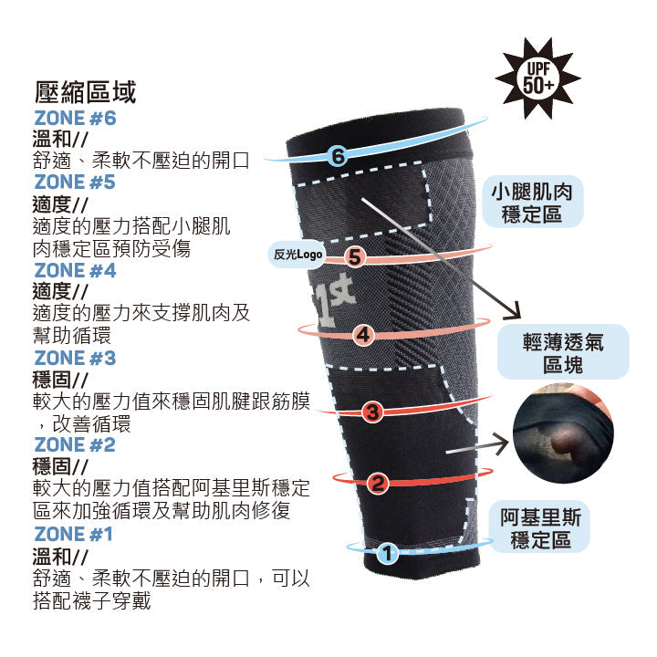 OS1st® TA6™ Thin Air Performance Calf Sleeves 輕薄透氣小腿加壓套使用專利分區壓縮技術,採用了頂級的精密針織機精準地將產品劃分多個壓力區域,針對肢體關節各部位提供不同壓力值的加壓和穩定,並舒緩因日常生活過度使用而產生的不適。