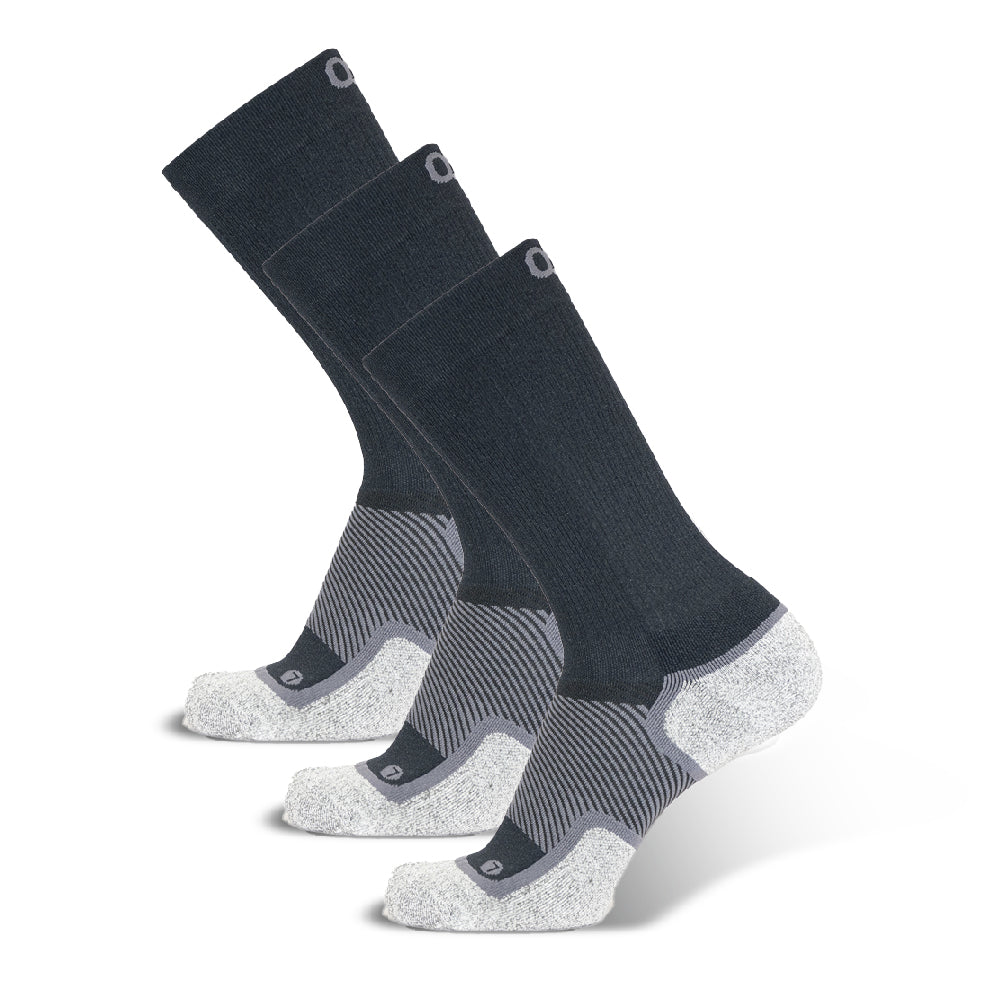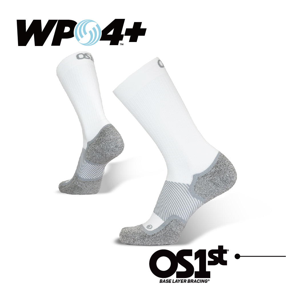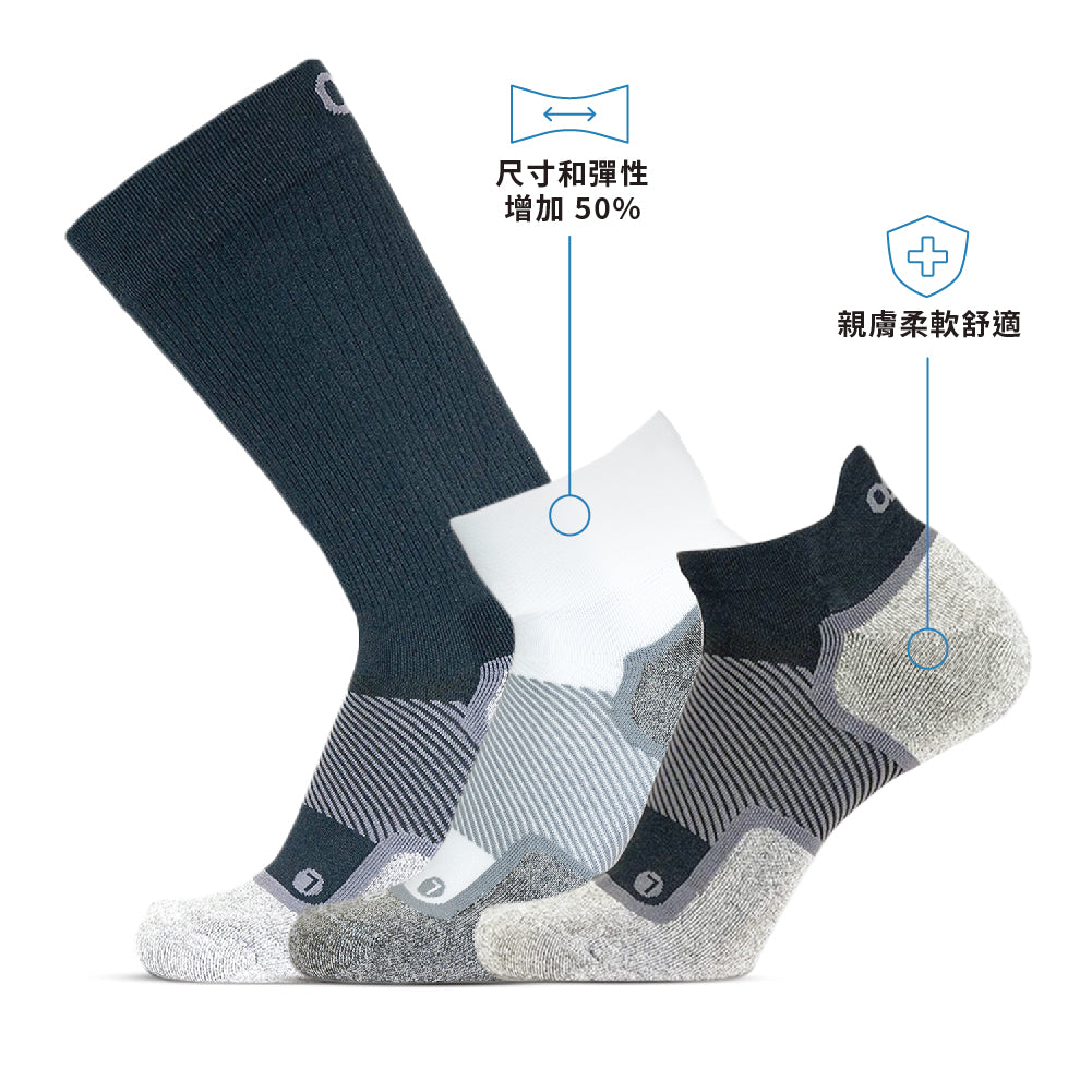 OS1st® WP4+™ Wellness Wide Performance Socks 足弓舒適健康襪(加寬版)。是為足部皮膚較為敏感的您而設計,使用奈米竹炭纖維材料製作,有助於維持足部皮膚的健康,從而將皮膚刺激的風險降至最低。並在腳趾和腳跟處附加了柔軟襯墊,為敏感的足部減少摩擦並提供額外的保護。足弓支撐設計能提供長時間運動中所需的額外穩定性。